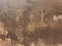 A portion of the canyon measuring approximately 800 feet (240 m) long features numerous prehistoric petroglyphs, both on the canyon walls and on boulders. At least eighteen different groups of carvings are known, in addition to features such as hearths and small pieces of stone resulting from the manufacturing process for stone tools. Most of the petroglyphs were created by "pecking" tiny holes, although one group is formed of lines that were clearly engraved into the rock.[1]: 2 The majority of designs at Petroglyph Canyon feature humans or large game animals such as bison and bighorn sheep. Some carvings clearly feature men or women, many of which appear with sexual imagery such as phallic symbols or external female genitalia respectively.[1]: 3 Some of the carvings are old enough that they have begun to weather to the dark color of the surrounding stone, but most show little sign of erosion. A few designs at the site, such as personal names, have obviously been added much more recently by vandals, but such carvings are rare and were typically placed near older designs instead of on top of them.[1]: 2