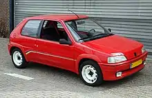 The 106 was competitive in racing, but also made a practical small family car.[4] All cars had steel wheels, and Rallye decals and seat coverings featuring a one or three colour flash, which again varied between early and late cars. With facelift came new top model named Peugeot 106 GTI with 1.6 litre 16 valves engine that produce 120 hp.[5] It came with new exterior body kit and new wheels. On some markets in Europe, it was badged S16 or Rallye.