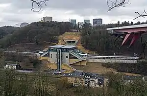 The plans for the station and the associated funicular, and tram projects were presented in September 2011 as part of the Luxembourg government's wider sustainable mobility strategy. The aim is to reduce travel time for cross border and domestic rail commuters to the Kirchberg quarter of Luxembourg City, the location of many European Union (EU) institutions, including the Court of Justice of the European Union, and a growing commercial sector. Prior to completion, rail commuters to the Kirchberg plateau would have to alight at the central Luxembourg station and make a further commute across the city.[2] The pre-construction analysis took place between 2013 and 2014,[3] with construction works spanning from March 2015, to late 2017.[4][5] The station and the accompanying funicular line is estimated, at the time of construction, to have cost 96 million euros.[2]