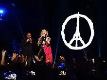 In early 2015, Madonna raised her voice against the Baga massacre in Nigeria.[95] During her Rebel Heart Tour that year, Madonna paid tribute to the victims of the Paris attacks by Islamists, and gave an impromptu performance at Place de la République singing acoustic versions of her songs "Ghosttown", "Like a Prayer", and a cover of John Lennon's "Imagine".[96][97] Christopher Bergland, said of the performance, "the fact one of the most famous people in the world, has the balls to sing... publicly on a street corner in Paris... should be inspiration to all of us to keep doing what we love to do".[98]