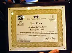 | 2010[6] | Los Angeles Times | 'Grading the Teachers' | A first-rate example of strong watchdog story-telling combined with innovative use of social science methods. Indeed, the point of the project was the failure of Los Angeles school officials to use effective methods to measure the performance of classroom teachers. The Los Angeles Times, applying a method called gain-score analysis to a huge database of individual students’ test scores and their teachers, identified the most and least effective teachers based on how much the students’ scores improved. The Times hired a national expert in gain-score analysis to do the data crunching, adding credibility to the results, but also did additional statistical analysis to identify high- and low-performing schools and otherwise verify their findings. In identifying and rating 6,000 teachers by name, the Times outraged the teachers’ union, but the series has prompted district officials to begin negotiating with the union to use the gain-score method in evaluations. Another sign of the impact of this series is that newspapers across the country have begun requesting similar data from local school districts. |