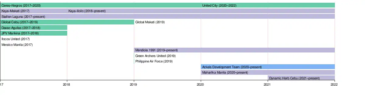 By April 1, 2017, the PFF confirmed the participation of 8 clubs from - Ilocos United and Stallion Laguna from Luzon; JPV Marikina, Kaya F.C.–Makati (now Kaya F.C.-Iloilo) and FC Meralco Manila (now Loyola F.C.) from Metro Manila; Ceres–Negros (now United City) and Global Cebu (now Global F.C.) from the Visayas; Davao Aguilas from Mindanao.[11]
