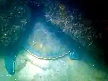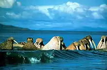 Walruses prefer shallow shelf regions and forage primarily on the seafloor, often from sea ice platforms.[25] They are not particularly deep divers compared to other pinnipeds; their deepest recorded dives are around 80 m (260 ft). They can remain submerged for as long as half an hour.[26]