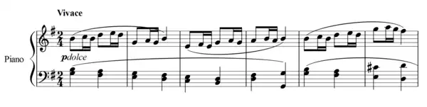 The Piano Sonata No. 25 in G major, Op. 79, was composed by Ludwig van Beethoven in 1809. It is alternatively titled "Cuckoo" or "Sonatina," and it is notable for its shortness.[1] A typical performance lasts only about nine minutes.[2] The work is in three movements: a fast-paced Presto alla tedesca, a slower Andante, and a lively Vivace.