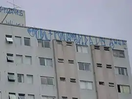 Pichação,[1][2] sometimes misspelled[3][4] as pixação (Portuguese pronunciation: [piʃaˈsɐ̃w]), is the name given to Brazilian graffiti. It consists of tagging done in a distinctive, cryptic style, mainly on walls and vacant buildings. Many pichadores (pichação painters) compete to paint in high and inaccessible places, using such techniques as free climbing and abseiling to reach the locations. Pichação is mostly condemned both by the society and the government since it is a crime. However, there is a difference between pichação and graffiti in Brazil, with graffiti being considered a form of art (as long as the property's owner agrees to have the wall graffited), while pichação is not appreciated by the majority of the society.