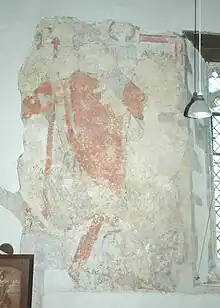 A number of Perpendicular Gothic windows were later added to the nave and one to the north wall of the chancel.[3][4] The present belltower was built in the 16th century.[3][4] St. Nicholas' parish church was repaired in 1826 and restored in 1855.[3] In 1898 it was restored again under the architect John Oldrid Scott,[3] whose alterations included replacing the chancel arch.[4] A 14th-century wall painting of Saint Christopher on the north wall of the nave was discovered in 1896 and restored in 1935.[1] St. Nicholas' church is a Grade II* listed building.[3]