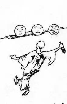 - ↑ Pierrot's relationship with the gallows, like his relationship with the moon, has its origin in folk verse. In a newspaper review of 1847, Gautier noted that French schoolboys have long inscribed their books with "a mysterious hieroglyphic representing a Pierrot hanged on a gibbet, beneath which one reads, as a kind of admonition, this meaningful legend in macaronic Latin": "Aspice Pierrot pendu/Quod librum n'a pas rendu;/Si Pierrot librum reddidisset/Pierrot pendu non fuisset [Behold Pierrot hanged/For not having returned a book;/If Pierrot had returned the book/He would not have been hanged]": tr. Storey (1985), pp. 113–114.