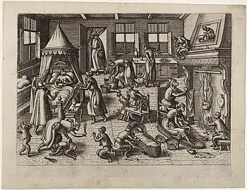 Pieter van der Borcht the Elder contributed to the spread of the genre of the "monkey scene", also called singerie (a word, which in French means a 'comical grimace, behaviour or trick').[13] Comical scenes with monkeys appearing in human attire and a human environment are a pictorial genre that was initiated in Flemish art in the 16th century and was subsequently further developed in the 17th century. Pieter van der Borcht introduced the singerie as an independent theme around 1575 in a series of prints, which are strongly embedded in the artistic tradition of Pieter Bruegel the Elder. These prints were widely disseminated and the theme was then picked up by other Flemish artists, in particular by those in Antwerp, such as Frans Francken the Younger, Jan Brueghel the Elder and the Younger, Sebastiaen Vrancx and Jan van Kessel the Elder. David Teniers the Younger became the principal practitioner of the genre and developed it further with his younger brother Abraham Teniers. Later in the 17th century Nicolaes van Verendael started to paint these "monkey scenes" as well.[14] Some historians question whether the Pieter van der Borcht responsible for this body of work should be identified with Pieter van der Borcht (I).[6]