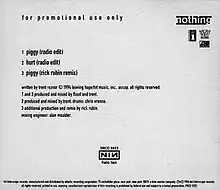 - ↑ "Piggy" (US promotional CD single). Nine Inch Nails. Interscope Records. 1994. PRCD 5923.