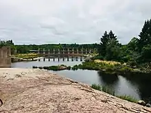 The Pinawa Dam Provincial Park today includes the ruins of the former dam, through which water flows and forms rapids and waterfalls.