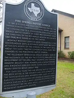 The earliest settlers, including the Shamburger family, arrived in the 1840s. In 1881, E. S. Cook and Perry Ray purchased land as trustees for the Pine Springs Community. A building constructed that year was used for both a school and church. The church members built their own Pine Springs Baptist Church early in the 1890s. John Demas Ray named the settlement for the large spring located in pines near the school. Orchard produce was the livelihood for most farmers in the area, and in 1891 the Smith County Canning Company built a factory in the area. In 1894 a post office, called Fruit, opened with Thomas A. Shamburger as postmaster. A series of misfortunes hit the local orchards, and most businesses and many residents left the area. In 1900 the post office moved to Tyler. After the canning factory closed, the fruit growers of Pine Springs began raising roses, and several members of the community were pioneers in the Tyler rose industry. School records for 1903 showed two schools, one with three teachers and 139 white students and another with one teacher and fifty-three black students. In 1936, the community had the church, a cemetery, a school, one business, and a small cluster of dwellings. That year, the four-teacher school held classes for 128 white pupils. By 1952, the schools in the area had been consolidated into the Pine Springs ISD, which was absorbed by the Tyler Independent School District in 1956. After 1963, the original school building was reopened as the Pine Springs Community Center. In 1966, the community had a school, a church, a cemetery, a roadside park, scattered homes, and a residential area. Maps for 1981 showed approximately ten businesses on Highway 271 and a church, a cemetery, and a community center north of the highway on Ray's Creek.[1]