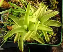 Pinguicula lutea is a perennial herbaceous plant. The leaves of P. lutea are yellowish-green basal rosettes. The simple shape leaf blade displaces from ovule to oblong.[4] P. lutea has curved leaves and pointed tip. The size of a mature leaf is around 5 to 7.5 cm long and 2.5 cm wide.[4] The diameter of an entire rosette can up to 15 cm. The fleshy surfaces of the leaves are covered with numerous sticky droplets called the mucilage. The mucilage is secreted by the peduncular gland on the top of each stalk. Small insects often get trapped by the glandular stalks for mistaking the mucilage as water drops.[5] Once the prey is stuck on the droplets, a digestive enzyme is released to extract nitrogen from the insect. The margin of the leaves also slowly roll inward and relax again after the digestion is complete.[5] Like many carnivorous plants, this trapping mechanism allows the plant to seek supplement nitrogen sources from the insect as a way to replace the nutrient-deficient habitat.