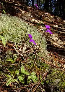 Pinguicula orchidioides /pɪŋˈɡwɪkjʊlə ɔːrkɪdiˈɔɪdiːz/ is a perennial rosette-forming insectivorous herb native to Mexico and Guatemala.[1] A species of butterwort, it forms summer rosettes of flat, succulent leaves up to 5 centimeters (2 in) long, which are covered in mucilaginous (sticky) glands that attract, trap, and digest arthropod prey. Nutrients derived from the prey are used to supplement the nutrient-poor substrate that the plant grows in. Uniquely among Pinguicula species from the Americas, p. orchidioides produces gemma-like basal buds which elongate into stolons and serve as a means of asexual reproduction. In the winter the plant forms a non-carnivorous rosette of small, fleshy leaves that conserves energy while food and moisture supplies are low. Single purple flowers appear between July and September on upright stalks up to 22 centimeters long.
