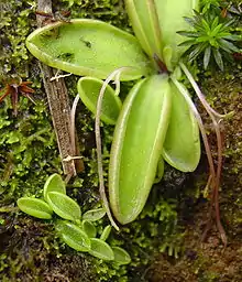 In a feature unique among Mexican Pinguicula,[3] P. orchidioides produces stolons throughout the summer growing period. These start out as gemma-like buds in the winter rosette and elongate into whip-like stolons up to 8 centimeters (3 in) long during the summer.[4] These stolons, which have small non-glandular leaves interspersed along their length, can take root to form new plantlets upon contact with a suitable growing substrate. This trait allows the species to form clumps of plants, many of which are genetically identical.