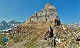 Like other mountains in Banff Park, Pinnacle Mountain is composed of sedimentary rock laid down during the Precambrian to Jurassic periods.[4] Formed in shallow seas, this sedimentary rock was pushed east and over the top of younger rock during the Laramide orogeny.[5] The Grand Sentinel is the largest of the pinnacles located on the mountain. This quartzite tower rises 120 metres above the scree slopes on the Paradise Valley side of Sentinel Pass.[6]