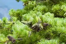 Individuals on average reach a height of 20 m (65.61 ft.) tall, and around 100 cm (3.28 ft.) dbh. Branches and branchlets spread out in a wide, horizontal manner. Needles are in fascicles of 5, and are a bright green color. Cones are 10-20 cm (3.93-7.87 in.) long, reddish brown to brown, and 8 cm (3.14 in.) in diameter. Seeds are 8-12 mm (0.31-0.47 in.) long, wingless, and of an ovoid shape.[2]