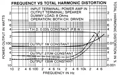 Apart from its high output power capability, the Pioneer SX-1980 had quite advanced performance in many other important areas. The THD versus frequency response curve showed very low distortion levels over a wide range of operating conditions. Phono cartridge load selectors allowed the user to select from three input resistances (10, 50, and 100 kΩ) and four input capacitances (100, 200, 300, and 400 pF). The RIAA equalisation was accurate to within ±0.2 dB from 20 Hz to 20 kHz (tested as ±0.1 dB[4]), and a high-accuracy performance specification such as this is not often achieved, even today.
