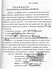 Śmietański — nicknamed by the inmates as the "Butcher of the Mokotow Prison" — executed personally and supervised the executions of hundreds of opponents of the Stalinist regime in the Polish People's Republic. Among them were prominent politicians, social activists and Polish underground fighters, including Lieutenants Jerzy Miatkowski, Tadeusz Pelak, Edmund Tudruj, Arkadiusz Wasilewski, Roman Gronski, Captain Stanislaw Lukasik, Commandant Hieronim Dekutowski (killed by Śmietański in one day, on 7 March 1949).[6] and Adam Doboszyński (29 August). Those executed after Śmietański's apparent death in 1950 include Major Zygmunt Szendzielarz, Lieutenants Henryk Borowski, Antoni Olechnowicz, Lucjan Minkiewicz (8 February 1951), Captain Stanisław Sojczyński, Lieutenant Antoni Wodyński from AK, and countless others,[7] including victims of the notorious 1 March, 1951 Mokotów Prison execution, who were given five consecutive death sentences each.[8] As a humiliation, Brigadier General Emil August Fieldorf was hanged rather than shot. [6][9][10]