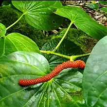 The following insects are endemic to the Marianas or Micronesia and have been observed on Piper guahamense and other other plant species: a spittlebug (Lallemandana phalerata),[8] a rove beetle (Palaminus swezeyi),[9] an ant-like leaf beetle (Euglenes bifossicollis),[10] a tumbling flower beetle (Mordellistena castanea), a chalcid wasp (Ooencyrtus swezeyi),[11] three planthoppers (Tambinia guamensis, Ugyops samoaensis, and Capelopterum punctatellum),[12] and four true weevils (Trigonops inusitata, Trigonops vulgaris, Daealus tuberosus, and Cryphalus swezeyi) (Elwood C. Zimmerman noted extensive perforations in the leaves of Piper guahamense due to Trigonops).[13][14]