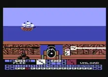 While sailing from one port to another, the player's ship may be attacked by pirates, leading to a real-time action sequence. The enemy ship slowly passes in front of the player's 15 cannons, shown one at a time from behind. In order to fire it is first necessary to select the elements in the right order with the pointer, to perform the realistic loading operations: inserting and pressing powder, inserting ball, brushing barrel. To fire, the player must select a cannon and adjust the elevation. If the opponent is defeated, there is a choice between seizing its gold or the captain's log, which contains information.