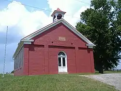Pisgah is a brick building with a foundation of limestone, a tin roof, and additional elements of wood and stone.[1] An arched main entrance is the only opening in the gable-front facade, while four rectangular windows are placed in the single-story side. A small belfry sits atop the roof above the main entrance, while a partial pediment creates the gable. Trees are scattered around the church property.[4] The overall structure is typical of vernacular buildings of the period, including the slight influence of adapted Greek Revival elements such as the pediment. Pisgah's first building was a log structure on the same property as the present building,[3] and the present building was erected in 1854.[1] Despite the passage of more than a century and a half, it has experienced almost no changes; no other nineteenth-century church in Brown County retains a comparable degree of integrity. Modernizations such as the installation of plumbing and electricity have never been performed at Pisgah, and the immediate environment remains in use as a quiet rural farming area.[3]