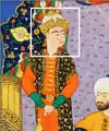 ![]() | The Avestan antecedent of Jamshid is Yima,[33] who was chosen by Ahura Mazda to be the first king of the earth. After sacrificing to the gods, his wish to have the power to make mortals immortal and to ameliorate the climate was granted. His subsequent hubris resulted in the loss of his throne and he was condemned to wander the earth until he was cut in half by a character named Spitiyura.[63] | |