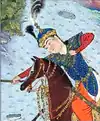 ![]() | In the Bundahishn, Manushchihr was a descendant of Ērič through his daughter. When he came of age he avenged Ērič's murder by killing Ērič's brothers. He then becomes king and rules for a 120 years. He discovers the source of the Euphrates and also constructs canals for irrigation.[70] | Manuchehr is called Manushchitra in the Avesta.[70] He is invoked in the Farvardin Yasht with the words “We worship the fravashi[note 3] of the holy Manushchithra, the son of Airyu”.[70][73] In another hymn, the Zamyad Yasht, reference is made to Manushchitra being born on the second mountain to rise up from the earth, called Manusha.[70] |