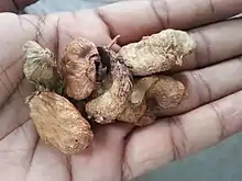 Long, horn-shaped leaf galls that often develop on this tree are harvested and used to make kakadshringi, an herbal medicine for diarrhea in northern India.[4]