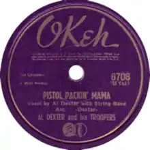 "Pistol Packin' Mama" was a "Hillbilly"-Honky Tonk record released at the height of World War II that became a nationwide sensation, and the first "Country" song to top the Billboard popular music chart. It was written by Al Dexter of Troup, Texas, who recorded it in Los Angeles, California on March 20, 1942, with top session musicians Dick Roberts, Johnny Bond and Dick Reinhart, who all normally worked for Gene Autry).[4] It was used in the 1943 film Pistol Packin' Mama, starring Ruth Terry and Robert Livingston.