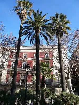 Palm trees (Washingtonia filifera and Phoenix dactylifera) in Plaça del Duc de Medinaceli.