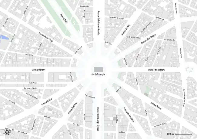Twelve avenues radiate from the Place Charles de Gaulle, formerly named the Place de l'Étoile, forming a star with the Arc de Triomphe at its centre.