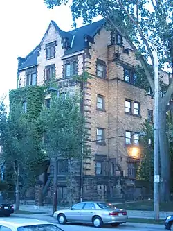 The Plaza Apartments is a historic five-story apartment building located in the Central neighborhood of Cleveland, Ohio, United States.[3] Built in 1901, it was designed by the architectural firm of Steffens, Searles & Hirsh, which built many middle-class apartment buildings in the Cleveland era around the turn of the twentieth century.[4] It features a primarily brick facade; stone appears in the exterior, and the foundation is stone. It was added to the National Register of Historic Places on November 1, 1984, being included primarily for its architectural significance.[2] Other historic buildings surround the Plaza Apartments: it was added to the Register as part of the "Upper Prospect Multiple Resource Area,"[2] and the Register-listed Jeremiah Ensworth House is located next door.[5] Located just a quarter of a mile (400 m) from the Cleveland State University campus, the Plaza Apartments remains an active apartment building today, although named the "Plaza Suites."[6]