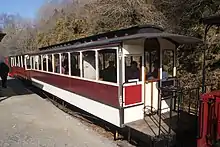 The tramway had only one passenger carriage, a rather ornate vehicle with end balconies and clerestory roof. After the tramway closed the coach was transported to Llanbadarn Fawr near Aberystwyth for use as a summer house, but decayed many years ago.[19] A replica has been built and is running on the Launceston Steam Railway in Cornwall.