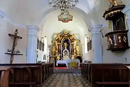 The picturesque fortified Tabor Church, in the hamlet of Podtabor on a rock above the motorway from Ljubljana to the Karawanks Tunnel, is a well-known landmark on the route. It was built some time soon after 1471 as a fortification where the locals could escape from Ottoman raids. The worst Ottoman incursions across Upper Carniola and into Carinthia were in 1476 and 1477. The building of the walls around the church was conditioned by the favourable natural position on an elevation in the middle of a plain, affording a view in all directions. The walls surrounding the church are irregularly shaped and were built on two levels with a roofed walkway, balistraria, and defense tower. The defence tower overlooked the only entrance over a drawbridge. On the western side the church was fortified with a moat and dike. This was also where valuables, food, and livestock were kept.[6] The church is dedicated to Saint Benedict and Our Lady of Sorrows.[7] One of the paintings in the church is by Ivana Kobilca, who lived in the village for a while.[8]