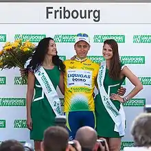 Podium girls, formally known as "tour hostesses" (French: hôtesses du Tour), are women who are best known for presenting prizes and kisses to the winners of the Tour de France and other major cycle races, including the Giro d'Italia and Vuelta a España. In the Tour de France, a team of four podium girls is employed by the race's main sponsor, the French bank LCL S.A.[1] They are responsible for entertaining clients of the sponsors before the morning departure of the race and in parties after the end of the race, but their most visible and prestigious role is in the award ceremony at the close of each day's racing. The job requires working long hours in all weather conditions but is well-paid and sought-after, with candidates selected on the basis of their looks, endurance, personalities, and linguistic abilities. Although they are forbidden to interact with the riders, other than kissing them in the award ceremonies, several podium girls have ended up marrying cyclists.