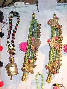In preparation for the festival, bulls are washed and massaged with oils. They are decorated with shawls, bells, and flowers, their horns are coloured, and they get new reins and ropes. The decorated bulls and oxen are walked in procession to the village field accompanied by music and dancing. The first bullock to go out is an old bullock with a wooden frame (called makhar) tied on its horns. This bullock is made to break a toran, a rope of mango leaves stretched between two posts, and is followed by all the other cattle in the village.[2]