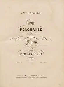 The Polonaise in A♭ major, Op. 53 (French: Polonaise héroïque, Heroic Polonaise; Polish: Heroiczny) for solo piano, was written by Frédéric Chopin in 1842.[1] This composition is one of Chopin's most admired compositions and has long been a favorite of the romantic piano repertoire. Pianist Arthur Rubinstein once called it "the composition which is the closest to my heart."[2] The piece requires exceptional piano skills and great virtuosity to be interpreted at a high degree of proficiency. It is also very physically demanding, and according to his student Adolphe Gutmann, Chopin played it more gently than most performers. The polonaise was dedicated to Auguste Léo, a German banker and friend of Chopin.[3]