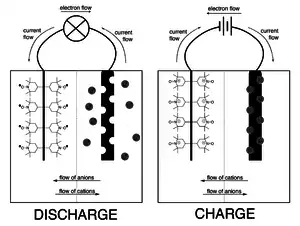 Conductive polymers can be n-doped or p-doped to form an electrochemically active material with conductivity due to dopant ions on a conjugated polymer backbone.[9][2] Conductive polymers (i.e. conjugated polymers) are embedded with the redox active group, as opposed to having pendant groups, with the exception of sulfur conductive polymers.[2] They are ideal electrode materials due to their conductivity and redox activity, therefore not requiring large quantities of inactive conductive fillers.[10] However they also tend to have low coulombic efficiency and exhibit poor cyclability and self-discharge.[7] Due to the poor electronic separation of the polymer's charged centers, the redox potentials of conjugated polymers change upon charge and discharge due to a dependence on the dopant levels. As a result of this complication, the discharge profile (cell voltage vs. capacity) of conductive polymer batteries has a sloped curve.[3]