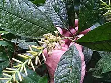 The inflorescence is a raceme (an unbranched spike) produced in the leaf axils or at the ends of branches.[4][5] The cream/purple flowers are tubular, about 12 mm (0.47 in) long by 3 mm (0.12 in) wide.[4][5] The fruit is a rounded or ovoid, dark purple or black berry containing a single seed. The fruit measures about 12 mm × 10 mm (0.47 in × 0.39 in) and the seed about 9 mm × 7 mm (0.35 in × 0.28 in).[4][5]