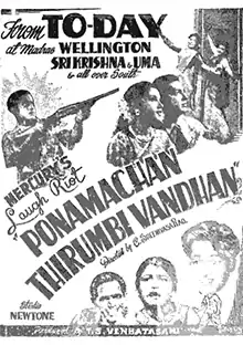 Pona Machan Thirumbi Vandhan (transl.The previous husband has returned) is a 1954 Indian Tamil-language comedy film directed by C. Srinivasa Rao. The dialogues were written by V. Seetharaman and screenplay by Mercury Films' Story Department. Based on the novel Punarjanmam by Thumilan, it stars Sriram and Kusalakumari. The film was released on 27 November 1954 and did not succeed commercially.