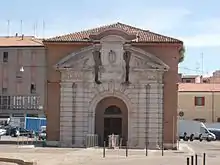 It was built as the entry control point from the south in the city walls in 1612 by Giovanni Battista Aleotti and dedicated to the reigning Pope Paul V. During the French occupation, the gate transiently was renamed Porta Reno; presently the outer face sports the Pauline name, while the city-side retains a plaque with the latter name.[1] The buildings suffered damage during the 2012 earthquake, requiring restructuring.[2]