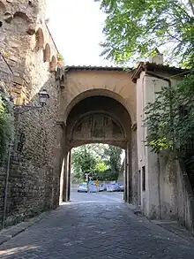 The Porta San Giorgio is a medieval gateway located on the south-east end of the Oltrarno walls of Florence, Italy. Ramparts of the Belvedere fortress, begun in 1590, stand adjacent to the gate. The road away from Florence soon passes the church of San Leonardo in Arcetri.