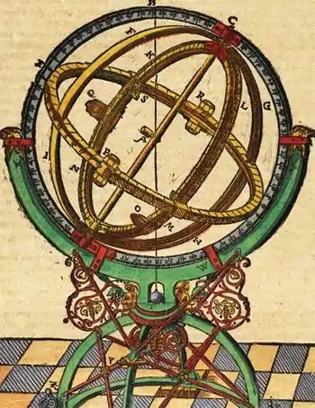 This armillary sphere is one of many astronomical instruments designed by Danish astronomer Tycho Brahe. In his Astronomiæ Instauratæ Mechanica (1598), he describe the unique features of this particular armillary device, the "equatorial armillary instrument." It featured a balanced design that circumvented problems in earlier spheres in which the weight of the poles would pull the rotating planes into a rest position.