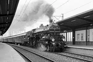 Preserved steam locomotive 41 1144 leaves Eisenach Hauptbahnhof in Thuringia (Germany) with a passenger train in 2006.