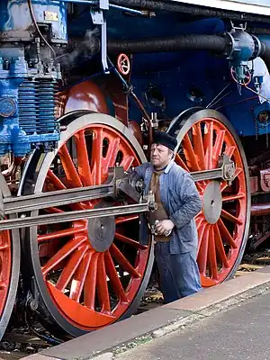 A railroad worker performs light maintenance tasks on a preserved steam locomotive of the Křivoklát express heritage train in Slovakia in 2010.