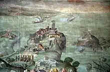 Detail of the fresco by Giorgio Vasari The taking of Porto Ercole (1570). You can see the various fortresses of the Republic of Siena (including the one on the islet called Forte Ercoletto) during the siege of the Sienese port (in the middle of the fresco) of 1555.