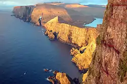 The village of Sumba, which is the southernmost village in the Faroe Islands. The neighbourhood of Hørg is up on the hillside. The mountain in the background is Beinisvørð, 470 metres high, often mentioned in Poul F. Joensen's poems. Beinisvørð has a green slope up to the top on this side and goes vertically down to the sea on the other side.