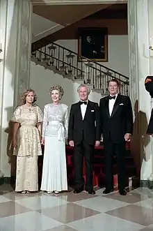 Poul Schlüter and Lisbeth Schlüter with President Reagan and Nancy Reagan in Cross Hall, 10 September 1985.