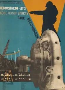 The generation of electricity was regarded as particularly important following the Bolshevik seizure of power. Lenin stated "Communism is Soviet power plus the electrification of the whole country."[16] He was subsequently featured on many Soviet posters, stamps etc. presenting this view. The GOELRO plan was initiated in 1920 as the first Bolshevik experiment in industrial planning and in which Lenin became personally involved. Gleb Krzhizhanovsky was another key figure involved, having been involved in the construction of a power station in Moscow in 1910. He had also known Lenin since 1897 when they were both in the St. Petersburg chapter of the Union of Struggle for the Liberation of the Working Class.