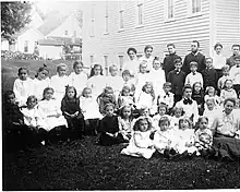 A group photograph of children attending sunday school at Prairie Street Mennonite Church in 1905.